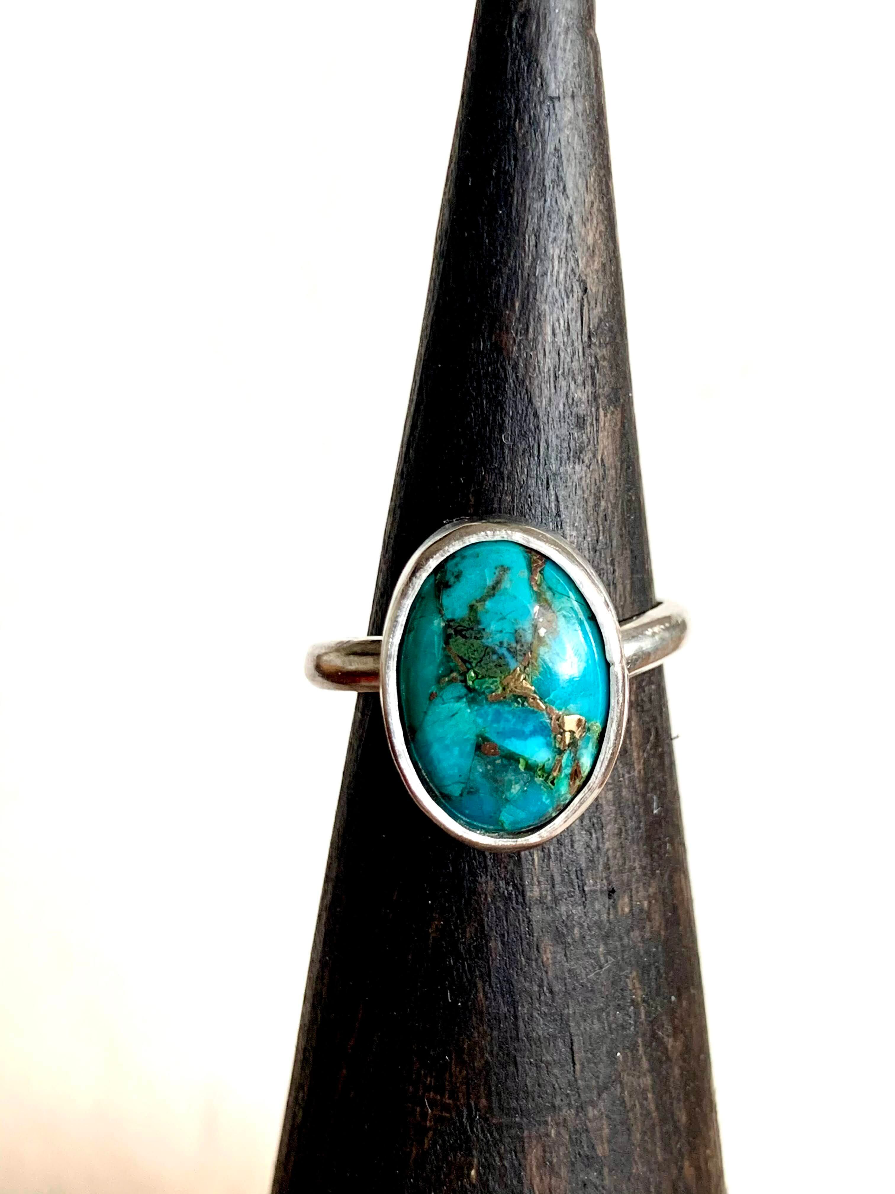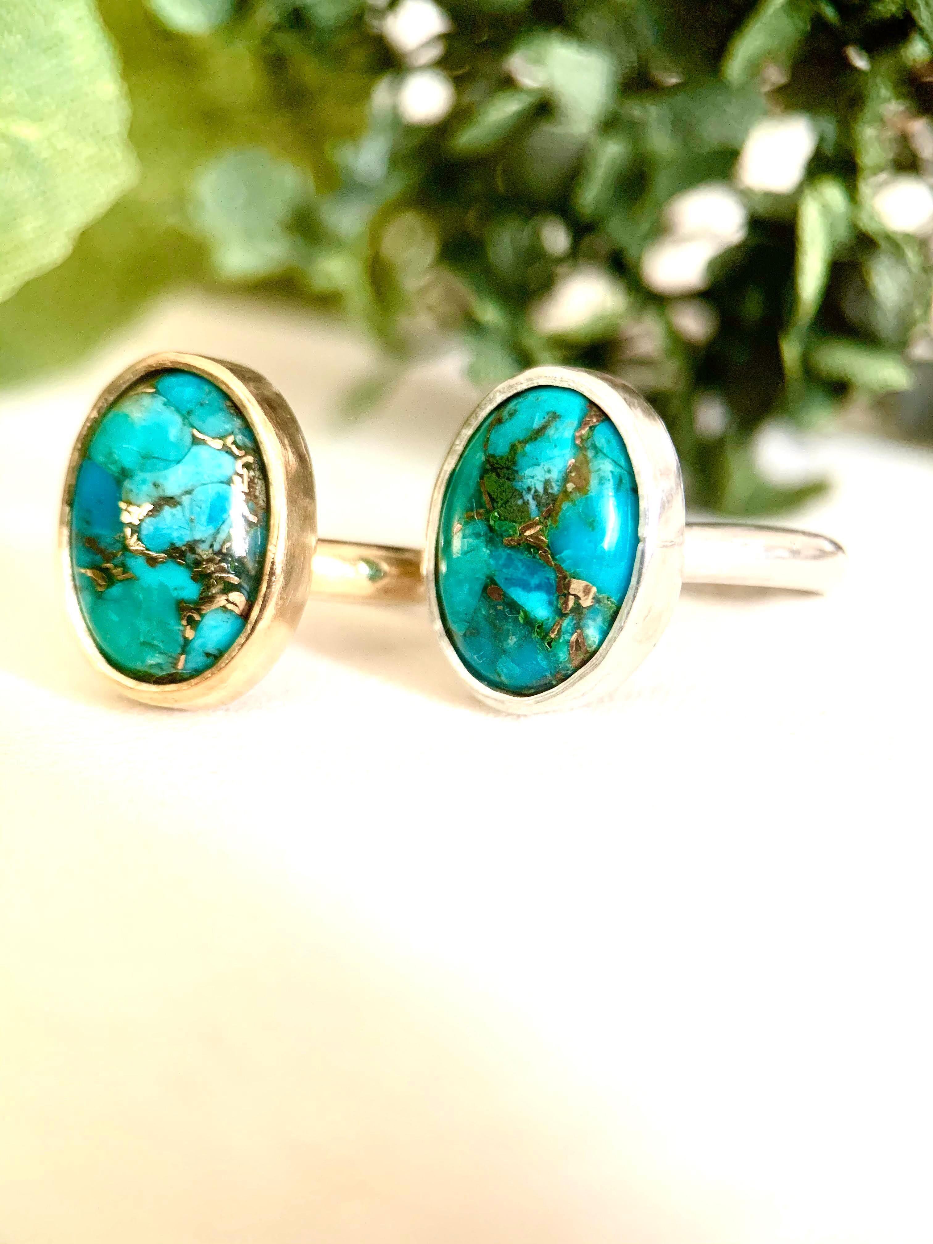 コッパーターコイズはコッパー(銅)とターコイズ(トルコ石)を圧縮し、貼り合わせた人工石です。パッチワークのような個性的な柄です。